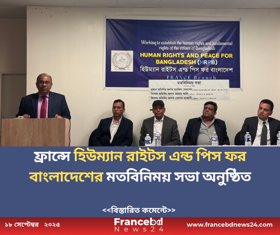 ফ্রান্সে মানবাধিকার ও জনস্বার্থ বিষয়ক সংগঠন হিউম্যান রাইটস এন্ড পিস ফর বাংলাদেশ (এইচআরপিবি)-এর উদ্যোগে এক মতবিনিময় সভা অনুষ্ঠিত হয়েছে। অনুষ্ঠানে প্রধান অতিথি হিসেবে উপস্থিত ছিলেন সংগঠনটির প্রেসিডেন্ট ও বাংলাদেশ সুপ্রিম কোর্টের সিনিয়র অ্যাডভোকেট মনজিল মোরশেদ।